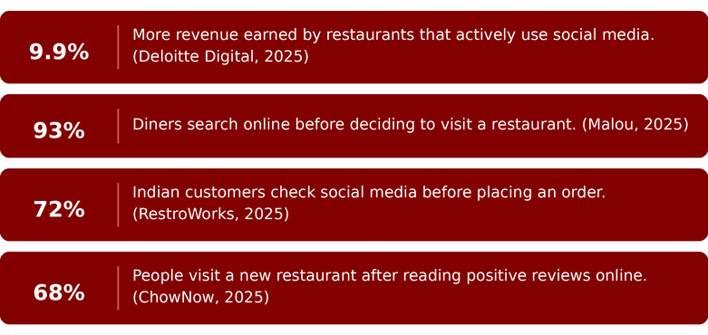 India has over 60 crore active social media users. Social media for restaurants is where new customers discover you. Research shows that most diners check a restaurant’s Instagram or Facebook even before they check Google.